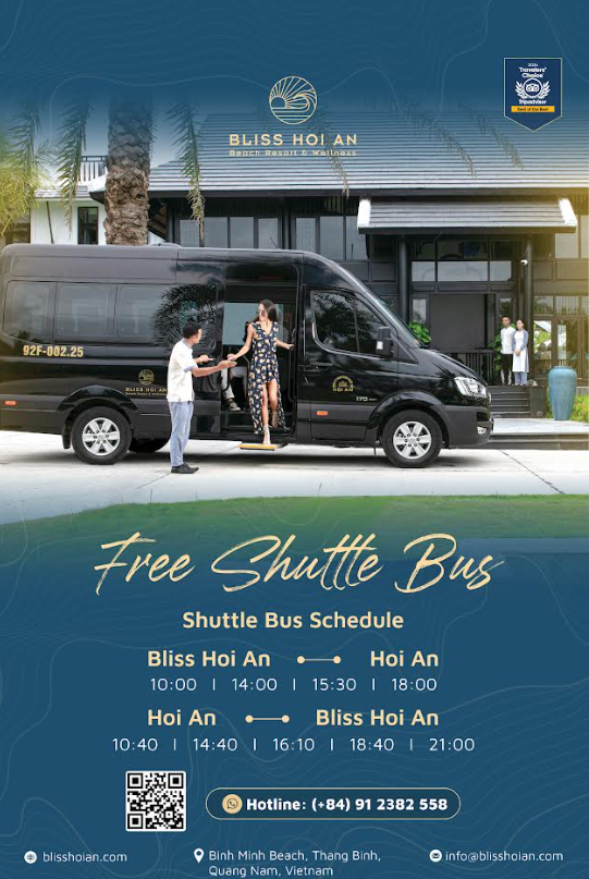 - 해당 상품에는 무료 공항 픽업 & 샌딩은 불포함 입니다. ___________ - 리조트 <-> 호이안 셔틀 서비스가 제공됩니다. - 현장에서 사전 신청 필수입니다 *** 셔틀버스 시간표 👉호이안 -> 리조트: 10:00 - 14:00 - 15:30 - 16:30 - 18:00 👉리조트 -> 호이안: 10:40 - 14:40 - 16:10 - 18:40 - 21:00