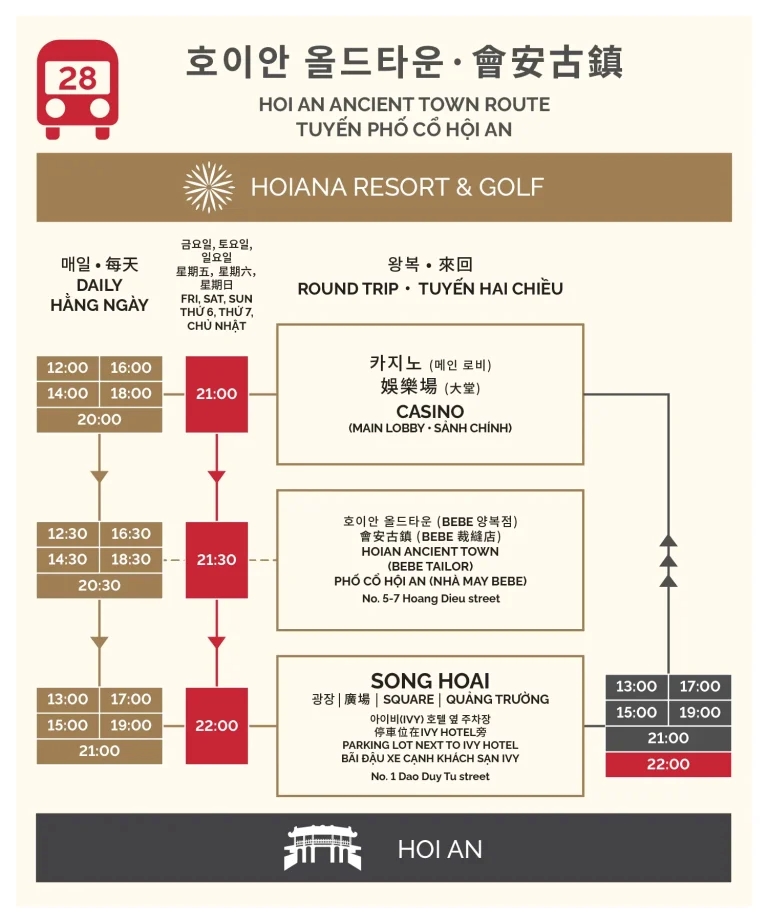해당 상품에는 무료 픽업/센딩 포함입니다. ----------------------- 리조트 <--> 공항 / 다낭 시내 / 호이안 타운까지시간표에 따라 무료 셔틀 제공합니다. *이용 방법 - 셔틀은 먼저 오는사람이 타고오는 시스템으로 사전예약 불가합니다. - 체크인 또는 이용 당일 프론트에서 예약 가능합니다. - 무료 공항 셔틀은 체크인 날짜와 일치해야만 이용이 가능합니다. - 셔틀 시간표에 따라 차량이 움직이기 때문에 공항에서 장시간 대기가 생길 수 있습니다.