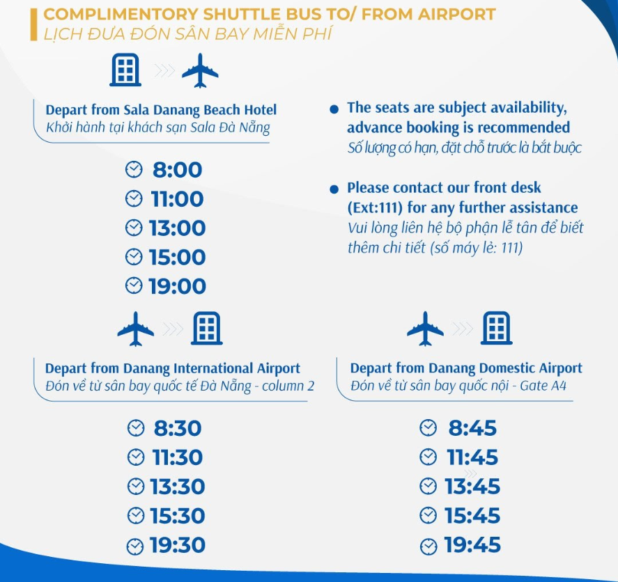 - 해당 상품에는 무료 공항 픽업 & 샌딩은 포함 입니다. 아래의 셔틀 일정을 참고해 보세요 +공항 픽업/샌딩 서비스를 예약하시려면, 아래 정보를 호텔에 제공해 주시기 바랍니다: 1. 예약 확인 번호 2. 고객 성함 및 대표 고객 연락처 3. 항공편 번호 및 도착/출발 예정 시간 🚨16인승 차량이며, 차량당 최대 10명까지 이용 가능합니다. 🚨공항 픽업/샌딩 서비스는 차량의 예약 가능 여부 및 호텔의 스케줄에 따라 확정됩니다. **이용 방법** - 예약 시 공항 도착일과 항공편명을 체크인 1주일 전 까지 카톡 채널로 보내주셔야 무료 공항 셔틀 이용이 가능합니다. - 항공사의 상황으로 항공편명 또는 스케줄 변경에 인폼이 없는 경우 발생하는 셔틀 명단 누락에 대해서는 책임지지 않습니다. - 무료 공항 셔틀은 체크인, 체크아웃 날짜와 일치해야만 이용이 가능합니다. - 공항에서 나오신 후 투숙하시는 리조트 이름이 적힌 피켓을 들고 계신 기사님을 찾아주시면 됩니다.