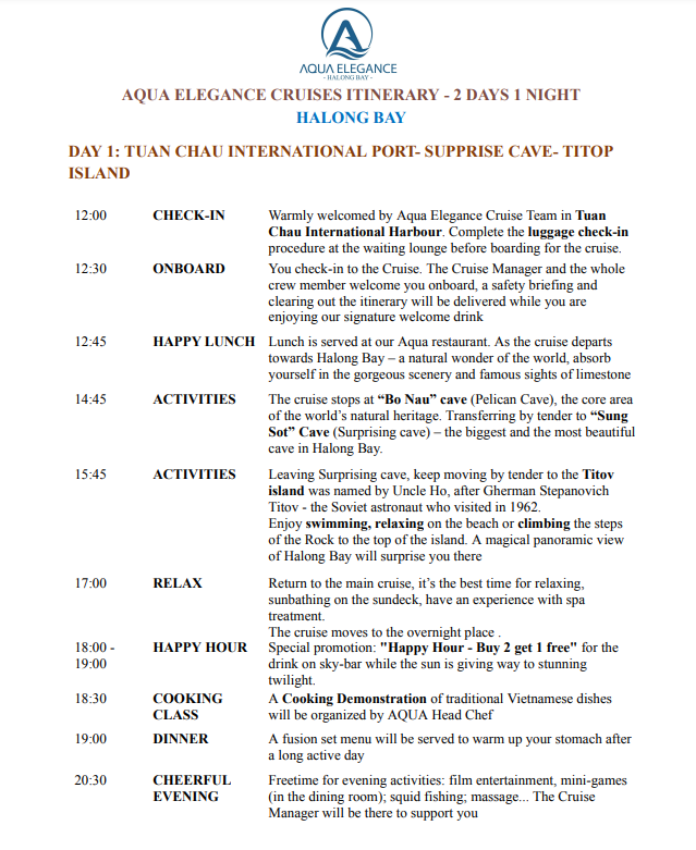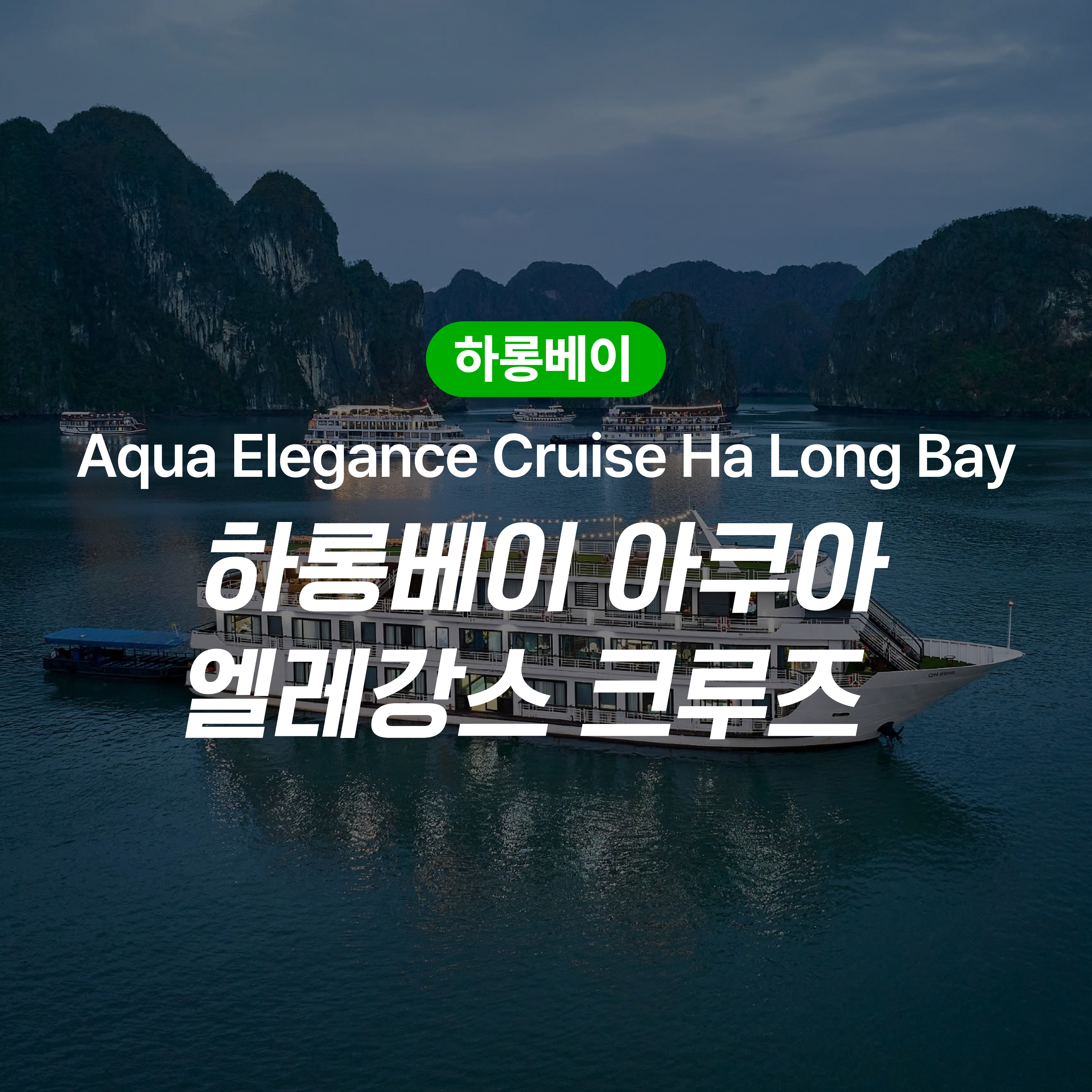 ❗예약 접수 후에는 반드시 피크타임 고객센터로 여권 사진을 보내주셔야 합니다. ❗체크인 최소 3일 전까지 보내주셔야 체크인 진행이 가능합니다. 💗 감사합니다! === ⛵ 피크타임 X 하롱베이 아쿠아 엘레강스 크루즈 프로모션 ⛵ 📅 예약 기간 : ~ 2026/12/30 📅 투숙 기간 : ~ 2026/12/30 🎁 공통 혜택 🎁 ✔ 체크인 당일 웰컴 드링크 제공 ✔ 전객실 5성급 수준 ✔ 객실 내 과일 1접시 제공 ✔ 일정에 따른 식사 포함 ✔ 선셋파티 제공 ✔ 카약이나 대나무 배 무료 이용, 동굴 탐험 포함 ✔ 생일 및 기념일을 위한 객실 장식 및 베이커리/꽃 제공 (사전 요청 필수) ✔ 관람권과 보험 포함 ✔ 요리 시연 및 다도 체험 ✔ 아침 태극권 수련 포함 ✔ 와이파이 무료 이용 ✔ 레스토랑에서 매일 가라오케 무료 ✔ 밤 오징어 낚시 도구 제공 ✔ 경험 많은 투어 가이드 있음 📌의무 갈라 디너 [2025/12/24 , 12/31] - 갈라디너 요금: 49$/인당/박당 ※ 해당 상품은 세금 별도입니다. 📍 크루즈 선착장 위치 📍 https://maps.app.goo.gl/23sYD9Uo6RTXHLKb9 🔴호텔 예약 진행 관련안내🔴 1. 예약접수 후 담당자가 객실가능여부 확인 후 예약이 진행되며, 객실이 불가할 경우 안내문자 또는 카카오톡으로 회신 후 취소처리 됩니다. 모든 예약은 실시간 룸체크 기준으로 예약이 진행되며, 최종 예약확정까지는 약 1~3일 정도소요되며, 컨펌이 불가한 경우 동일 안내연락 드리고 취소 진행해드리고있습니다. 2. 예약 완료 후 추가, 변경, 취소 및 요청 사항은 아래 링크(피크타임 고객센터)로 문의해 주세요. 👉피크타임 고객센터: http://pf.kakao.com/_vMapxj