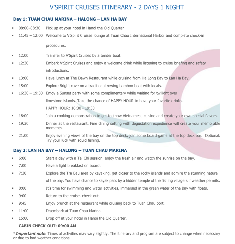 ❗예약 접수 후에는 반드시 피크타임 고객센터로 여권 사진을 보내주셔야 합니다. ❗체크인 최소 3일 전까지 보내주셔야 체크인 진행이 가능합니다. 💗 감사합니다! === 📢📢 피크타임 X 하롱베이 뷔스피릿 크루즈 2026 프로모션 진행! 📅 예약 기간 & 스테이 기간: ~ 2026/09/31 ✨하이시즌✨ 2025/10/01 - 2025/12/31 🌹 공통 혜택 🌹 ➕ 웰컴 드링크 및 따뜻한 손수건 제공 ➕ 각 객실당 기준인원까지 풀보드 식사 제공: 점심 01회, 저녁 01회, 아침 01회, 브런치 01회 ➕ 객실 내 무료 차, 커피, 미네랄 워터 2병 ➕ 영어 투어 가이드 탑승 ➕ 다양한 활동 있음: 아침 태극권 수업, 노 젓는 보트로 동굴 탐험, 오징어 낚시, 수영, 카약,.... ➕ 입장료 및 관광비 포함 ※ 해당 상품은 객실 요금에 부가세(VAT) 불포함! 😊SPECIAL DAYS SURCHARGE 😊 ✨피크시즌: 2025/12/24 & 2025/12/31✨ ❗성인 : 41$/ 1인당 / 1박당 📍 크루즈 선착장 위치 📍 https://maps.app.goo.gl/87Fw7tBMGzahXjYM8 🔴호텔 예약 진행 관련안내🔴 1. 예약접수 후 담당자가 객실가능여부 확인 후 예약이 진행되며, 객실이 불가할 경우 안내문자 또는 카카오톡으로 회신 후 취소처리 됩니다. 모든 예약은 실시간 룸체크 기준으로 예약이 진행되며, 최종 예약확정까지는 약 1~3일 정도소요되며, 컨펌이 불가한 경우 동일 안내연락 드리고 취소 진행해드리고있습니다. 2. 예약 완료 후 추가, 변경, 취소 및 요청 사항은 아래 링크(피크타임 고객센터)로 문의해 주세요. 👉피크타임 고객센터: http://pf.kakao.com/_vMapxj