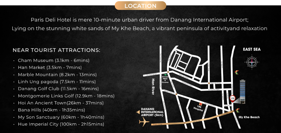 ✈️ 가까운 공항 다낭 국제공항 (DAD) - 4.8km 푸바이 국제공항 (HUI) - 68.9km 🚌 버스 및 기차역 Da Nang Railway Station - 3.8km 다낭 센트럴 버스터미널 - 7.7km