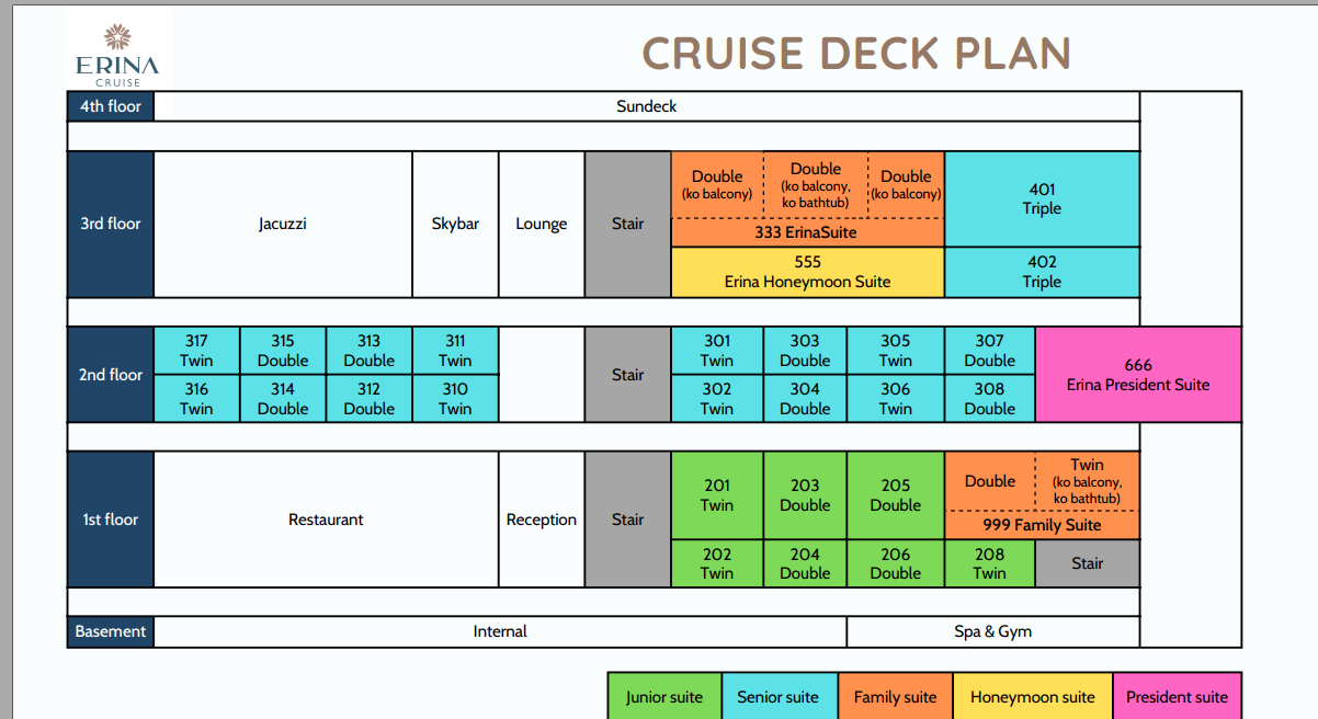 👉주니어 스위트 - 객실은 성인 2인 1실 기준 - 최대 투숙인원 : 성인 3인 또는 성인2 + 소아1 투숙가능 (추가금 발생) 👉시니어 스위트 - 2층 - 객실은 성인 2인 1실 기준 - 최대 투숙인원 : 성인 3인 또는 성인2 + 소아1 투숙가능 (추가금 발생) 👉트리플 시니어 - 2층 - 객실은 성인 3인 1실 기준 - 최대 투숙인원 : 성인 3인 또는 성인4 + 소아1 투숙가능 (추가금 발생) 👉패밀리 스위트 - 1층 + 2층 - 객실은 성인 4인 1실 기준 - 최대 투숙인원 : 성인 5인 또는 성인4 + 소아1 투숙가능 (추가금 발생) 👉에리나 허니문 스위트 - 3층 - 객실은 성인 2인 1실 기준 - 최대 투숙인원 : 성인 3인 또는 성인2 + 소아1 투숙가능 (추가금 발생) 👉에리나 프레지던트 스위트 - 2층 뱃머리 - 객실은 성인 2인 1실 기준 - 최대 투숙인원 : 성인 3인 또는 성인2 + 소아1 투숙가능 (추가금 발생)