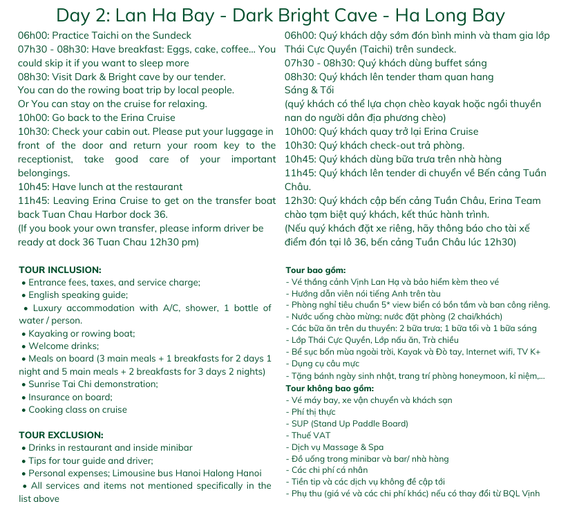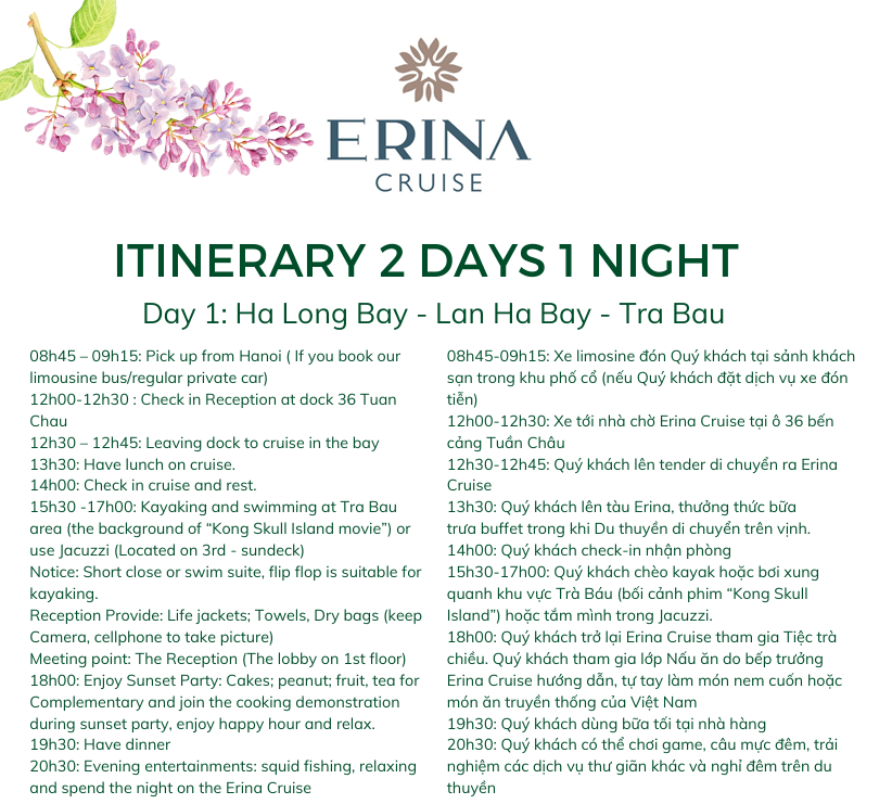 ❗예약 접수 후에는 반드시 피크타임 고객센터로 여권 사진을 보내주셔야 합니다. ❗체크인 최소 3일 전까지 보내주셔야 체크인 진행이 가능합니다. 💗 감사합니다! === 🙈 피크타임 X 하롱베이 에리나 크루즈 프로모션 진행! 📅 예약 기간 : 2026/01/01 ~ 2026/12/31 📅 스테이 기간: 2026/01/01 ~ 2026/12/31 ⛔ 취소/환불/변경 불가합니다! 🥽 공통 혜택 🥽 👉전문 영어 가이드 제공 👉크루즈 식사: - 2일 1박 투어: 총 4식 (주식 2회 세트 메뉴, 석식 1회 뷔페, 조식 1회 뷔페) 👉란하베이(Lan Ha Bay) 관광 입장권 포함 👉인터넷 및 K+ TV가 제공 👉웰컴 드링크 및 객실 내 생수 제공 (1인당 2병) 👉애프터눈 티 제공 (스낵, 신선한 과일, 차, 케이크 등) 👉쿠킹 클래스 & 태극권 수업 제공 👉자쿠지, 카약, 낚시 도구 등 이용 가능 👉허니문 및 결혼기념일 고객을 위한 객실 장식 제공(종이학 접기 + 꽃 장식 포함) ※ 예약접수후 카카오톡 고객센터로 요청해야 합니다. 👉생일 당일 체크인/체크아웃 고객을 위한 생일 케이크 무료 제공 👉 Sáng – Tối 동굴(항상동굴) 나노 보트 체험 👉 객실당 4세 미만 유아 1인 투숙 무료 제공 (쉐어베드) ※ 해당 상품은 세금 불포함! 💘에리나 허니문 스위트 & 에리나 프레지던트 스위트 베네핏💘 + 특별 셋업 제공 – 수입 와인 1병, 생화 꽃다발 1개, 신선한 과일 플레이트 1접시, 객실 장식 제공 (학 모양 타월 아트 및 장미꽃잎 장식) 👉주의: ✔음식 알레르기 또는 채식 등의 식이 제한이 있는 고객은 사전에 알려주시기 바랍니다. ✔체크인 절차를 위해 신분증(주민등록증/여권) 또는 어린이의 경우 출생증명서를 지참해 주세요. ✔유아용 죽과 우유를 제외하고, 외부 음식 및 음료는 크루즈에 반입하실 수 없습니다 (규정에 따라 추가 요금 부과) ❗투어 일정은 불가항력 상황, 날씨 조건 또는 베이 관리 위원회의 정책에 따라 변경될 수 있습니다. 📍 크루즈 선착장 위치 📍 https://maps.app.goo.gl/SV1AyzigPzGYfDJq7 🔴호텔 예약 진행 관련안내🔴 1. 예약접수 후 담당자가 객실가능여부 확인 후 예약이 진행되며, 객실이 불가할 경우 안내문자 또는 카카오톡으로 회신 후 취소처리 됩니다. 모든 예약은 실시간 룸체크 기준으로 예약이 진행되며, 최종 예약확정까지는 약 1~3일 정도소요되며, 컨펌이 불가한 경우 동일 안내연락 드리고 취소 진행해드리고있습니다. 2. 예약 완료 후 추가, 변경, 취소 및 요청 사항은 아래 링크(피크타임 고객센터)로 문의해 주세요. 👉피크타임 고객센터: http://pf.kakao.com/_vMapxj