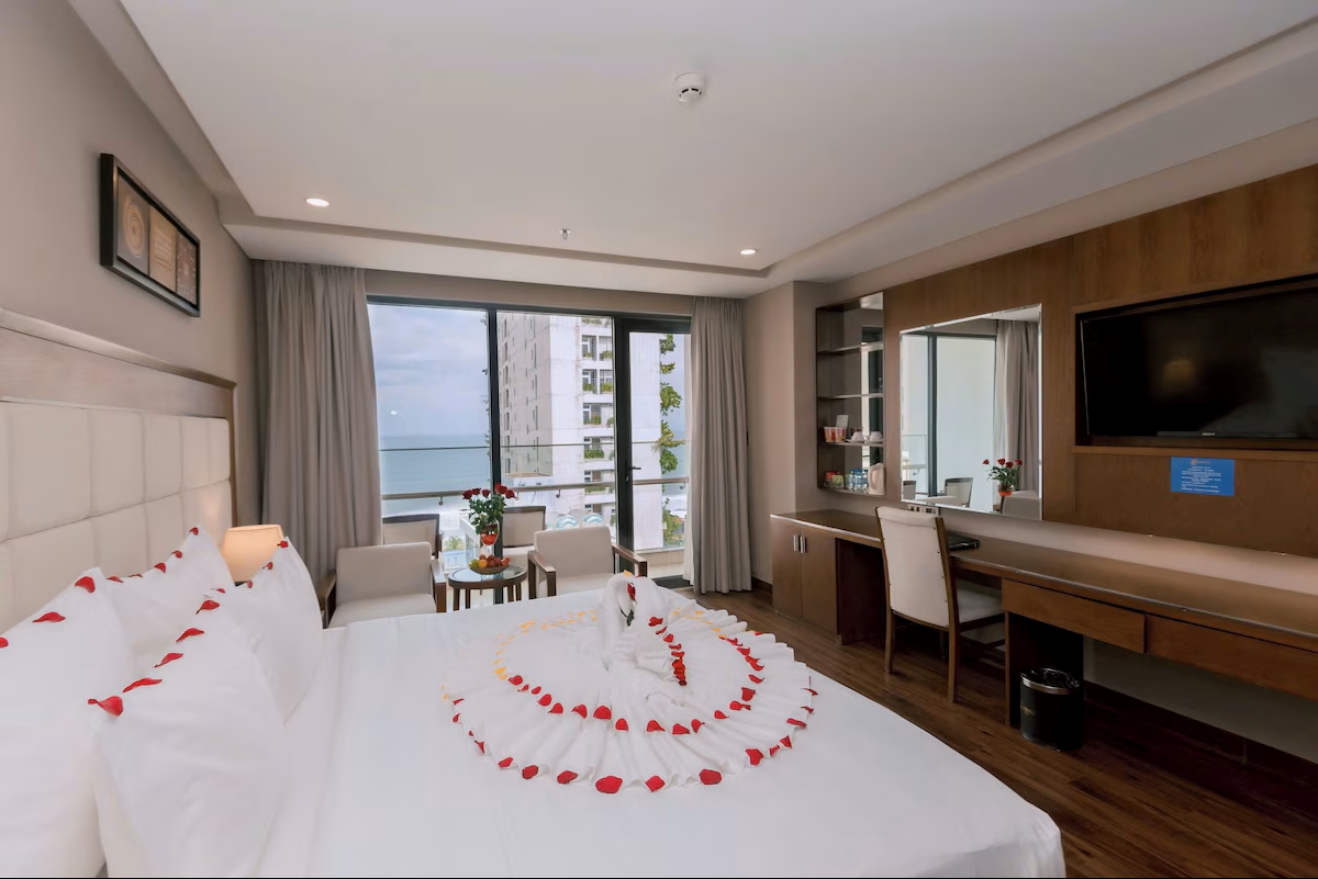 🏨 기본 정보 • 이름: Grand Sea Hotel Danang (그랜드 씨 호텔) • 등급: ★★★★ 호텔 • 주소: 08 Ha Bong, Phuoc My, Son Tra District, Da Nang, Vietnam • 체크인 14:00부터, 체크아웃 12:00까지 🛏️ 객실 • 객실 수는 약 100개이며, 모던하고 고급스럽게 꾸며져 있음. • 다양한 객실 타입 (예: Deluxe Spa, Junior Suite) 있고 퀸/킹사이즈 침대, 자쿠지 또는 스팀배스 등이 있는 룸도 있음. • 발코니가 있는 방, 시티 뷰 또는 바다뷰 룸 있음. 🏊‍♀️ 편의 시설 • 수영장: 실내 수영장, 일년 내내 이용 가능함 • 레스토랑: 현지 및 인터내셔널 요리를 모두 제공함. 특히 해산물 요리도 있음 • 헬스장 있음 • 스파 & 마사지: 전신 마사지, 커플 마사지 가능, 웰니스 패키지 있음 📍 위치 • 미케 비치(My Khe Beach)와 매우 가까우며 걸어서 갈만한 거리예요. • 용다리(Cau Rong), 한강 다리(Cau Song Han) 등 시내 관광지와도 접근성이 좋습니다. ✈️ 가까운 공항 • 다낭 국제공항 (DAD) - 약 5.5km