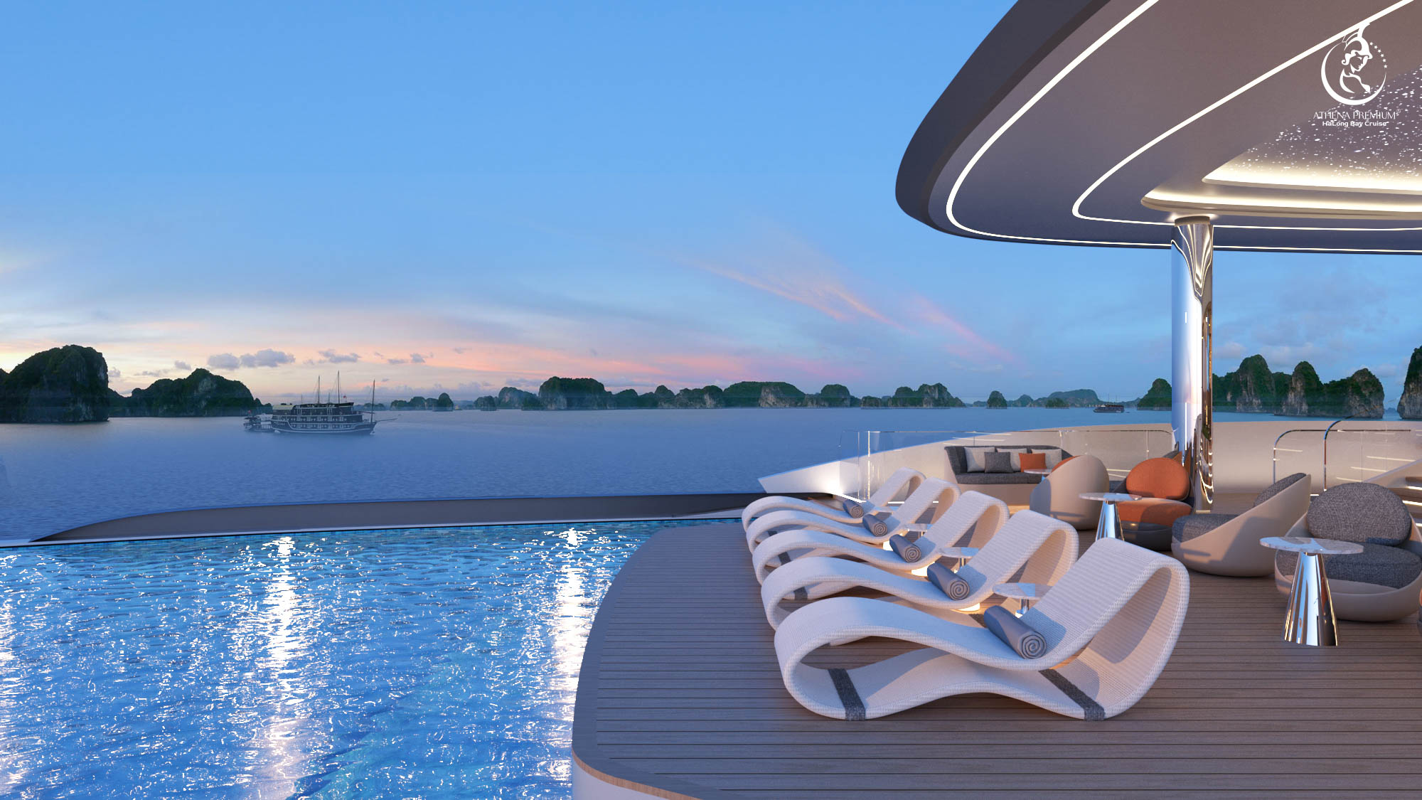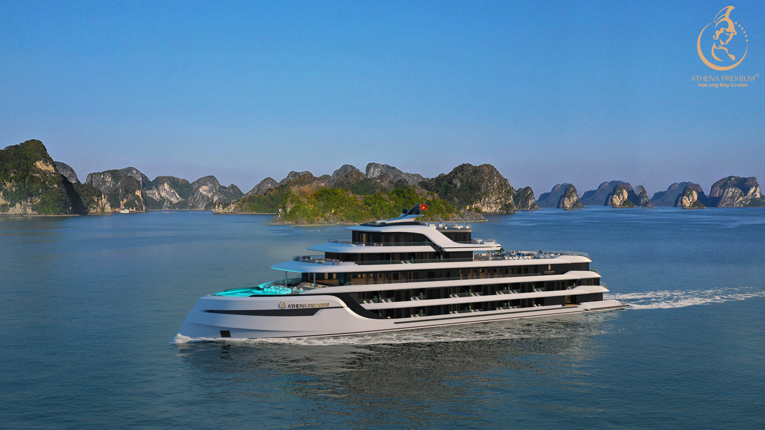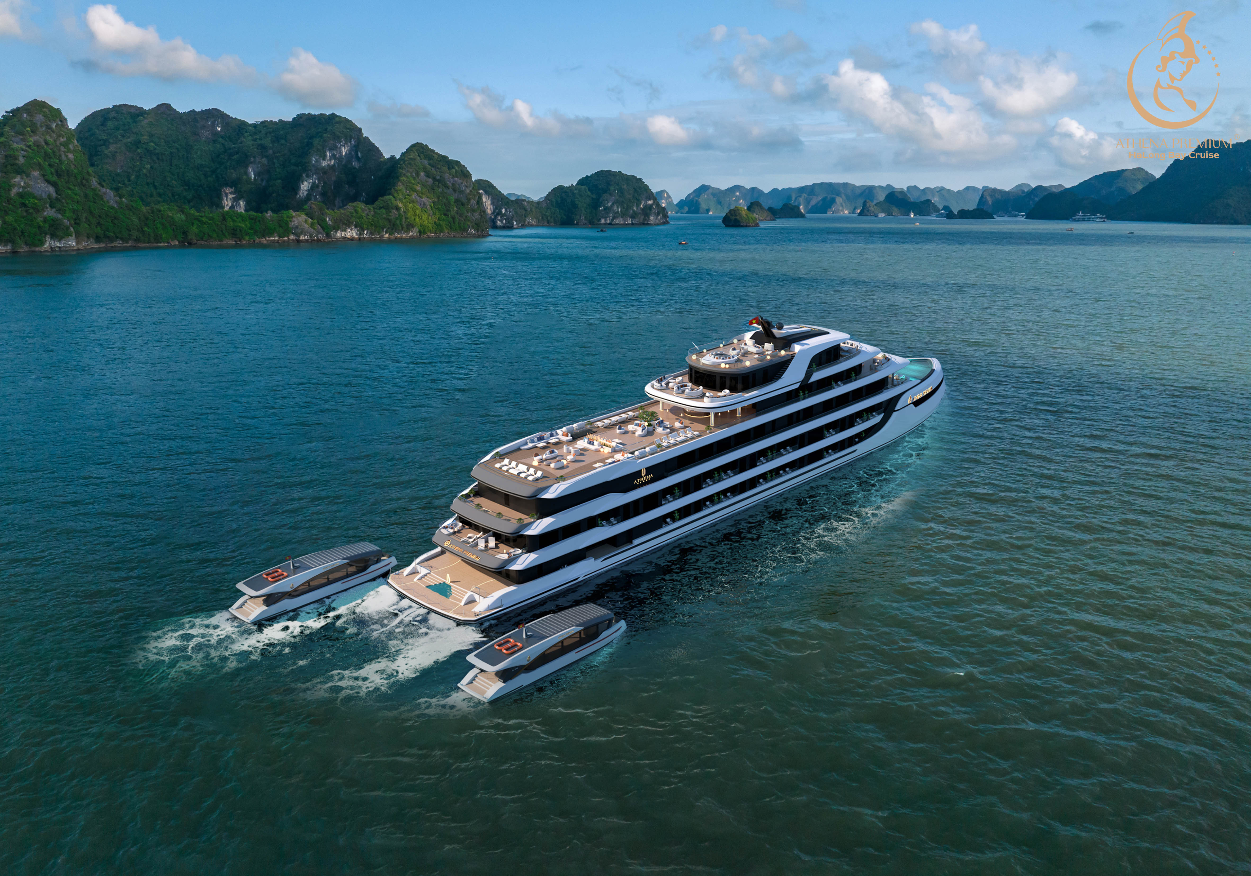 하롱베이 6성급 아테나 프리미엄 크루즈는 전 객실 오션뷰와 세련된 디자인을 갖춘 초호화 웰니스 크루즈입니다.